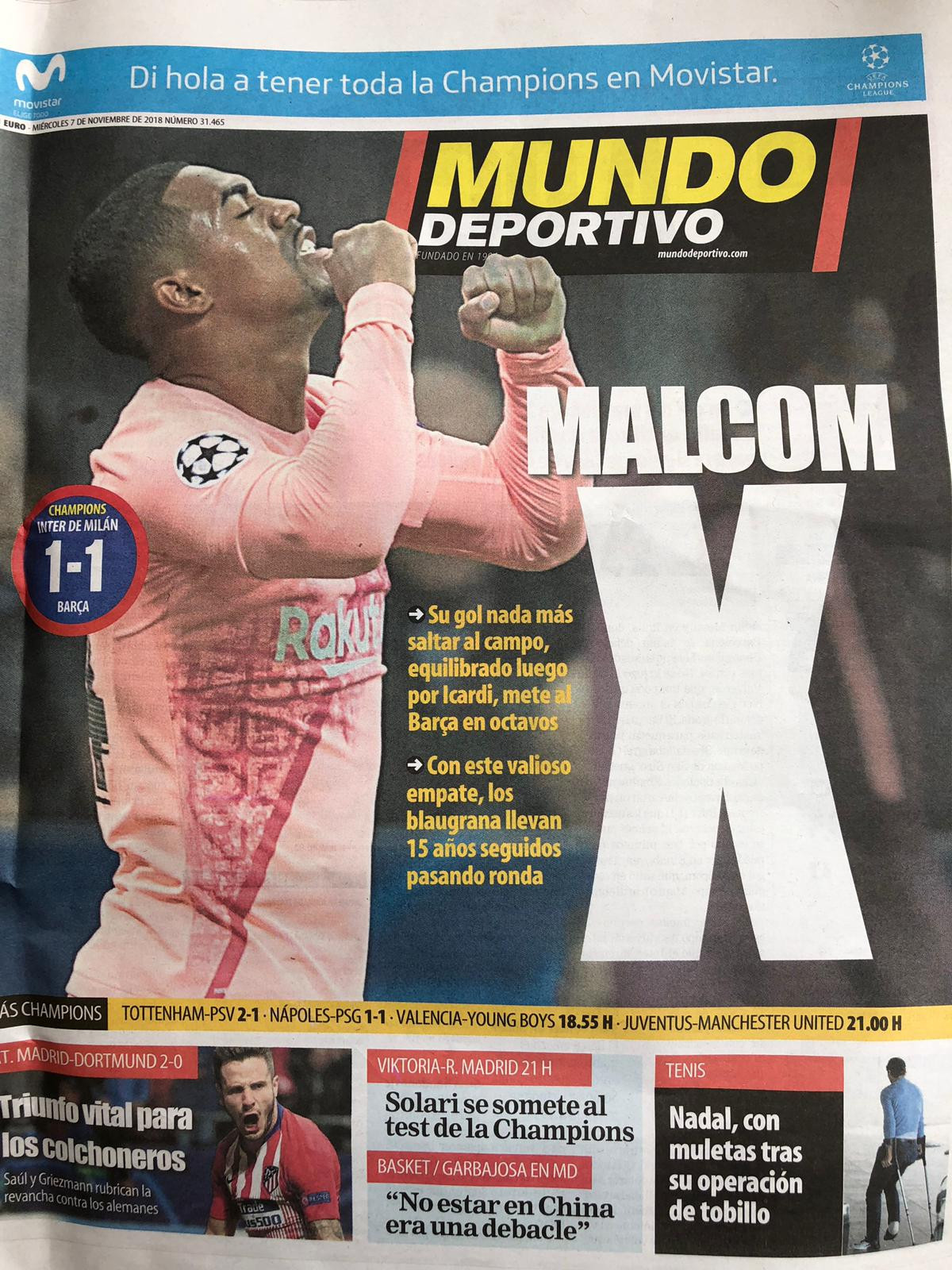 “Segna Malcom e il Barça centra gli ottavi”: così AS regala un trafiletto dedicato alla squadra di Valverde in prima pagina, con il brasiliano che “Compare per staccare il biglietto” per gli ottavi. Spazio anche alle tante dichiarazioni dei protagonisti nel post partita, tra gli allenatori (“Il Barça è meglio e lo ha dimostrato, ma non ha potuto batterci” le parole di Spalletti, seguite da un Valverde felice per il “Grande spettacolo visto, come a Wembley”). Malcom entra e segna per un gol che “Segna la propria carriera e può cambiargli la vita”, da elemento che “Aiuterà molto la squadra”.