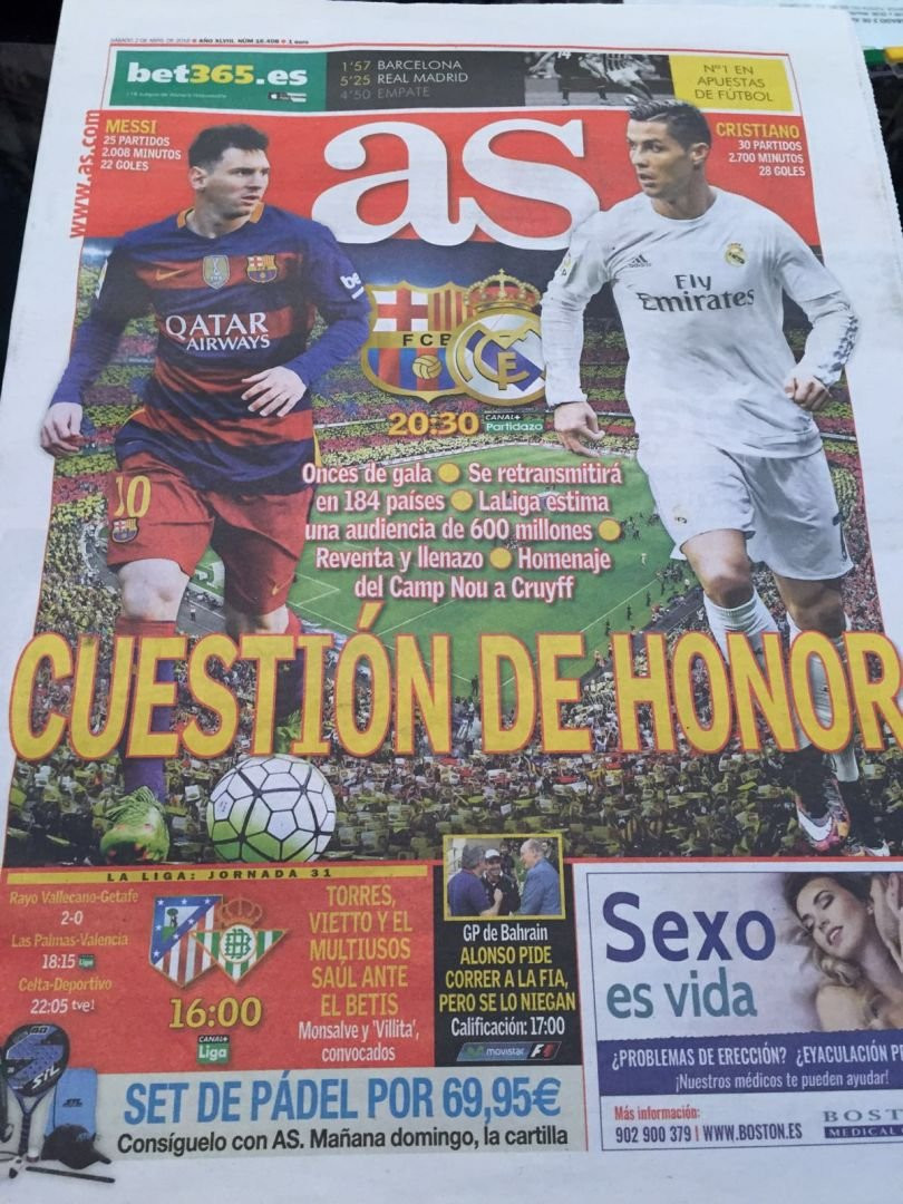 Da una sfida all’altra, da un quotidiano all’altro. ‘AS‘ dedica la prima a Messi e Cristiano Ronaldo, una confronto nel confronto che si trasforma in una ‘Questione d’onore’. 184 paesi collegati, 600 milioni di telespettatori, l’omaggio a Cruijff e tre punti da conquistare: c’è tutto questo nella notte del Camp Nou! Le lancette scorrono veloci, le ore si susseguono, le 20.30 si avvicinano, mettetevi comodi, il Clasico delle stelle sta per cominciare.