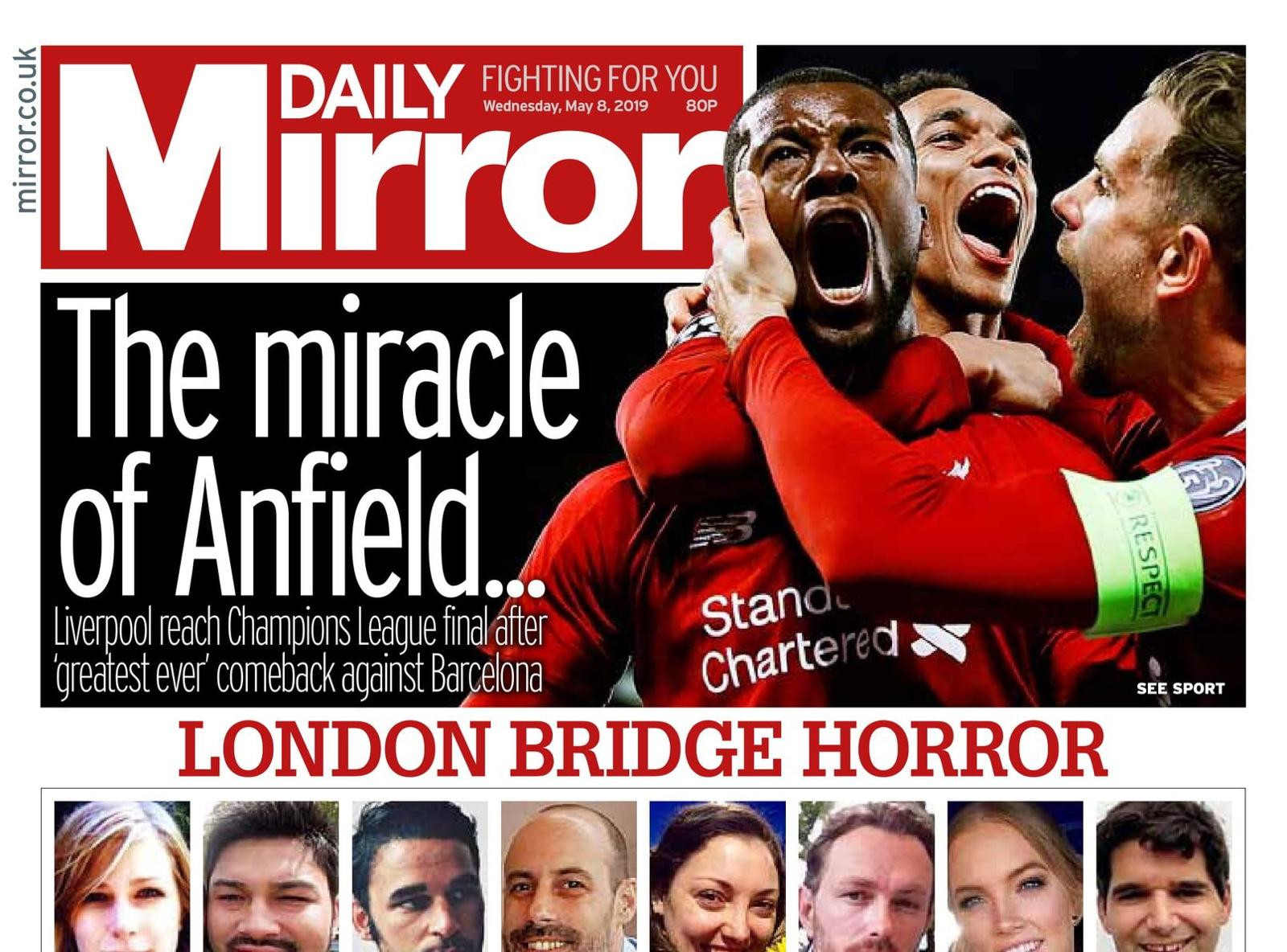 Dalla Spagna all’Inghilterra, dove Echo gioca con il soprannome ‘Red’ del Liverpool per costruire il suo titolo: “IncREDibili”. Sul Mirror, invece, si legge de "Il miracolo di Anfield: i Reds distruggono il Barça e vanno in finale". "Kop a load of that" si legge invece nel taglio laterale del The Sun: il quotidiano inglese gioca sull'assonanza cop/Kop.