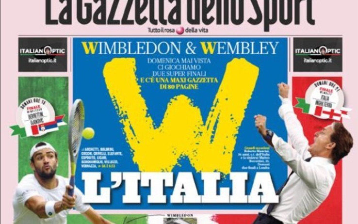 Matteo Berrettini e la sua storica finale di Wimbledon dominano le prime pagine di tutti i quotidiani sportivi: accanto a lui, spazio anche alla Nazionale, che si avvicina alla finale contro l’Inghilterra.