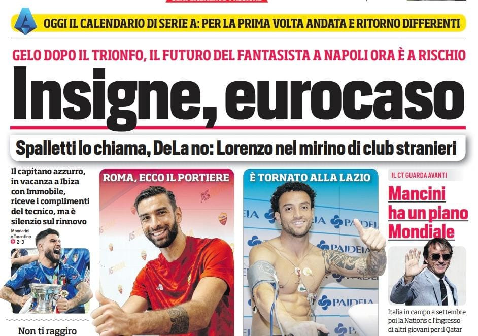 A tre giorni dalla vittoria dell’Europeo, il trionfo dell’Italia è ancora sulla bocca e di tutti. Ne parlano anche i giornali in edicola mercoledì 14 luglio. Dall’esclusione di Chiellini dalla top 11 UEFA fino al futuro di Lorenzo Insigne. Inoltre c’è anche tanto mercato.