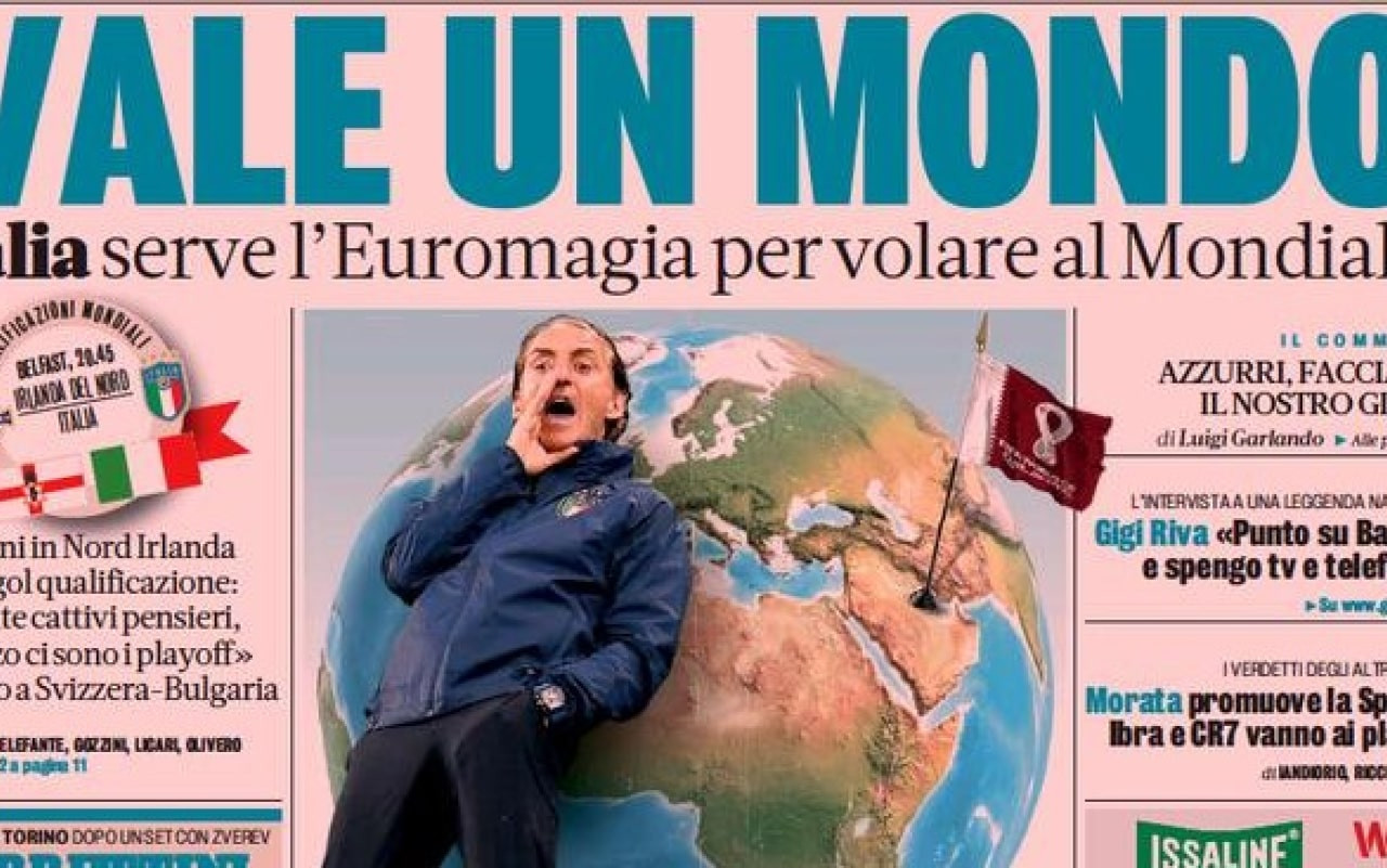 Le prime pagine di lunedì 15 novembre si concentrano ovviamente sull’attesa di Irlanda del Nord-Italia, gara decisiva per la qualificazione degli Azzurri di Roberto Mancini al prossimo Mondiale 2022 in Qatar.