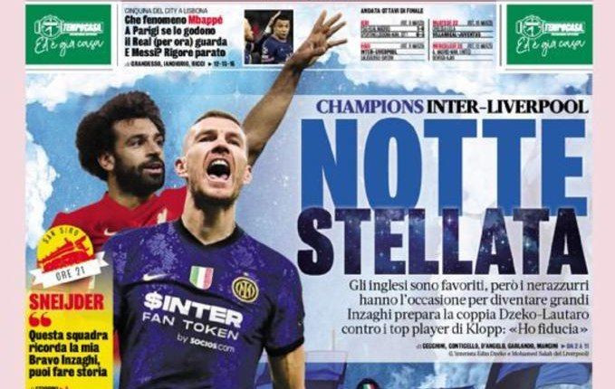 Le prime pagine sportive dei quotidiani in edicola mercoledì 16 febbraio si concentrano sull’attesa di Inter-Liverpool, gara d’andata degli ottavi di finale di Champions League, e sul successo del Paris Saint-Germain contro il Real Madrid, grazie alla magia di Kylian Mbappé.