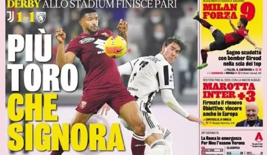 Dopo gli impegni nelle coppe europee, spazio al campionato. La 26a giornata di Serie A si è aperta con il pareggio tra Juventus e Torino nel derby della Mole. Questo e molti altri temi nelle prime pagine dei principali quotidiani sportivi e noi in edicola oggi, sabato 19 febbraio 2022.