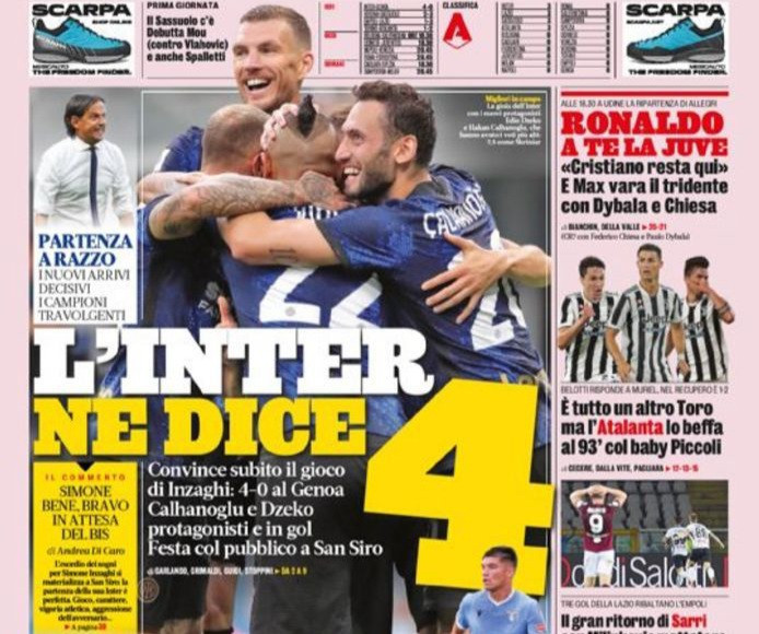 Le prime pagine di domenica si dividono fra le prime quattro sfide di Serie A vissute sabato e le notizie di calciomercato, mentre si avvicina la fine della sessione estiva.