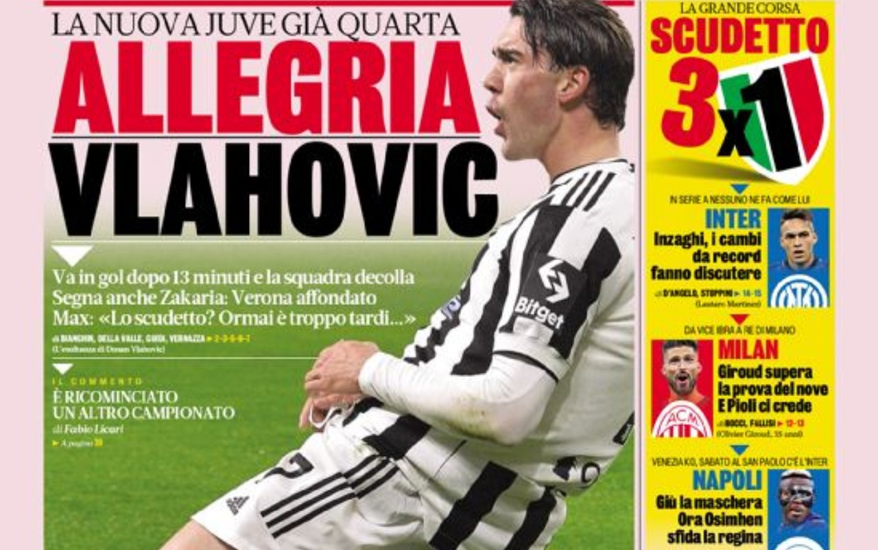 Le prime pagine sportive dei quotidiani in edicola lunedì 7 febbraio si concentrano sulla vittoria della Juventus firmata dai nuovi arrivati Vlahovic e Zakaria. C’è spazio anche per la vittoria esterna a Venezia del Napoli, che accorcia sull’Inter in classifica, e i tre punti fondamentali in ottica salvezza per il Cagliari a Bergamo.