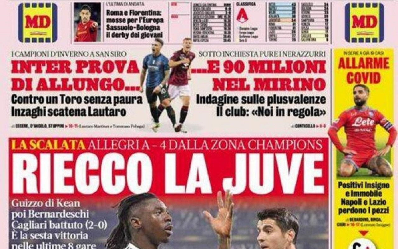 La Juve chiude il girone d’andata con una vittoria per 2-0 sul Cagliari e si riporta a -4 sull’Atalanta, che pareggia a Genova. L’Inter finisce sotto indagine per plusvalenze fittizie, niente proroga per la Salernitana. Questi i temi principali dei quotidiani in edicola mercoledì 22 dicembre 2021.
