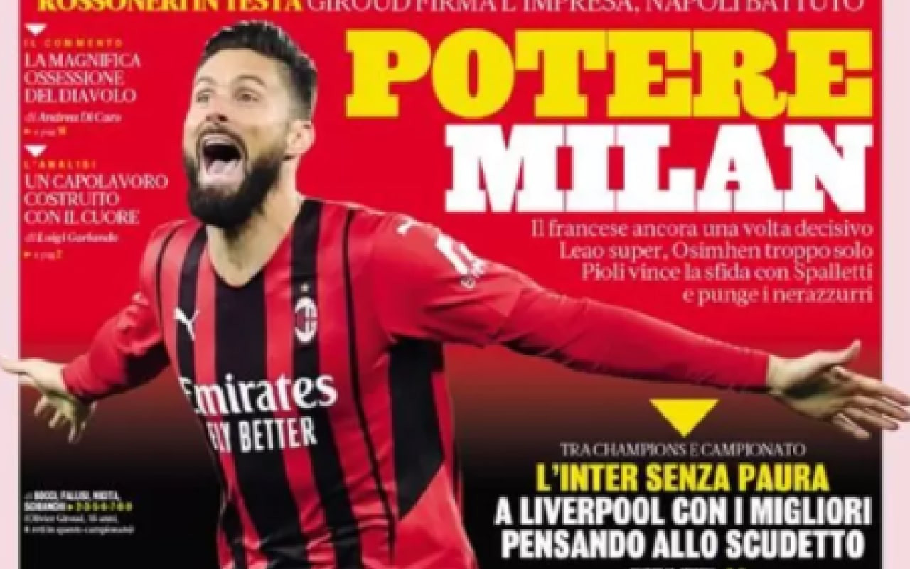Lo scontro scudetto vinto dal Milan contro il Napoli monopolizza i principali quotidiani sportivi italiani: Giroud segna e fa sognare in grande i tifosi rossoneri. La Juve intanto vince con lo Spezia e allunga sulle rivali per la Champions. Questi i principali temi sui quotidiani in edicola lunedì 7 marzo 2022.