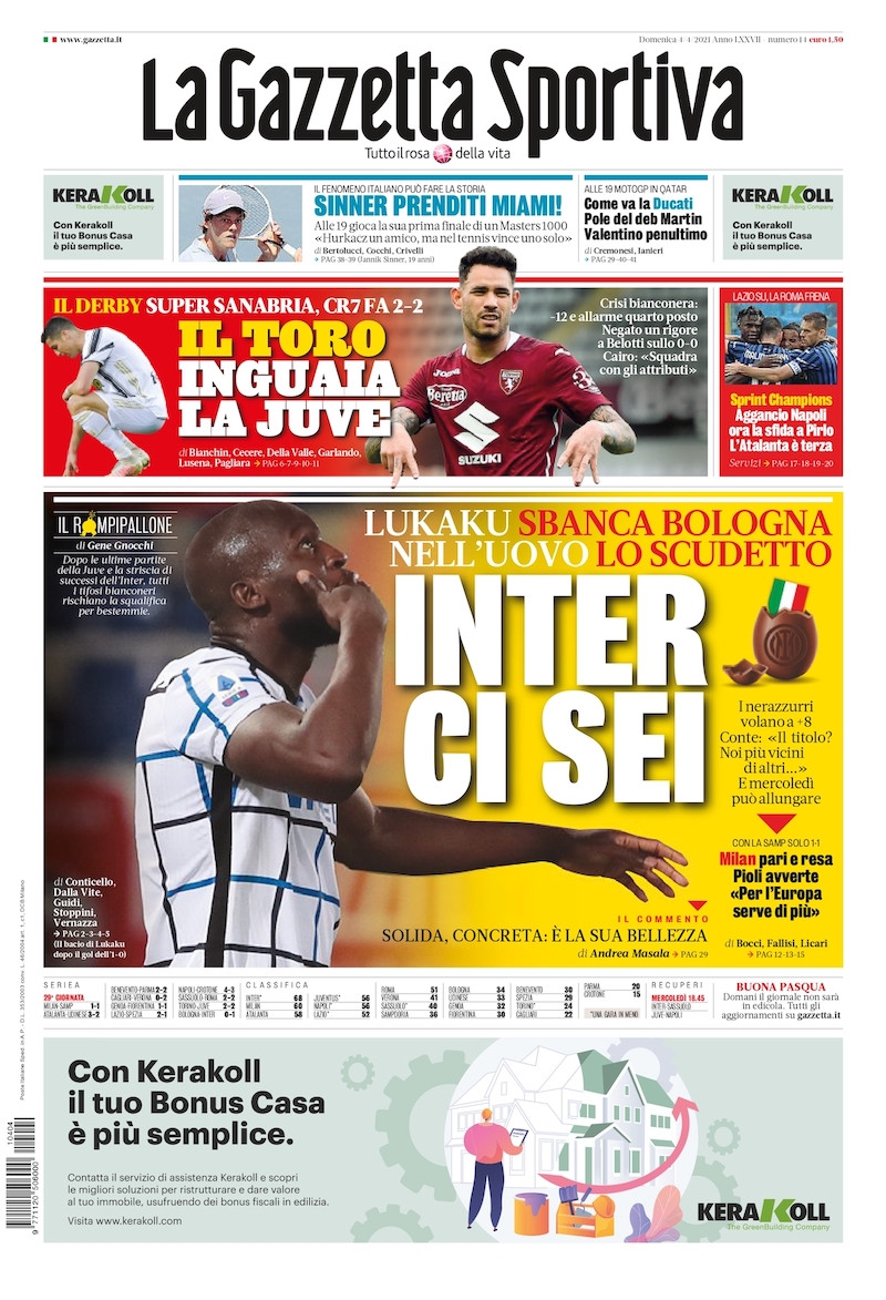 L'Inter batte il Bologna 1-0 e vola a +8 dal Milan che ha pareggiato in casa contro la Sampdoria. La Juventus fa 2-2 nel derby contro il Torino e perde terreno dalla zona Champions complici le vittorie di Atalanta e Napoli. I partenopei saranno i prossimi avversari dei bianconeri in settimana. In zona salvezza cade il Cagliari, che va a -2 dal Torino. Questi e altri temi nelle prime pagine dei quotidiani sportivi e non in edicola oggi.
