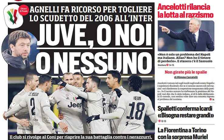 Coppa Italia e calciomercato dominano le prime pagine dei quotidiani in uscita domenica 13 gennaio. “Juve, o noi o nessuno” è l’apertura del Corriere dello Sport, legata alla decisione del club bianconero di ricorrere al CONI per lo Scudetto del 2006. Tuttosport, invece, dedica la propria apertura a Moise Kean: “Un gol ai buu”.