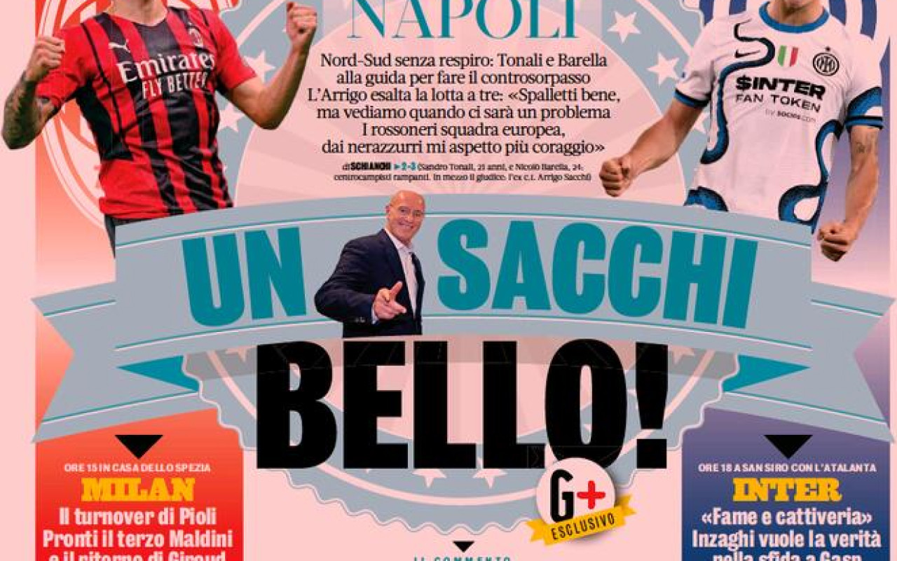 Il ritorno in campo della Serie A è il tema principale sulle prime pagine dei quotidiani in edicola sabato 25 settembre. La sesta giornata si aprirà con tre anticipi: inizia il Milan, in casa dello Spezia, poi il big match Inter-Atalanta e, infine, Genoa-Torino.