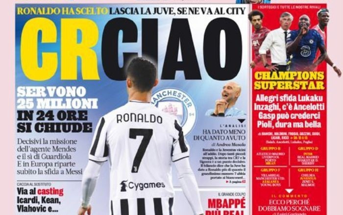 L’addio di Ronaldo alla Juventus, la trattativa Real-Psg per Mbappé e i sorteggi di Champions League, ma anche la seconda giornata di campionato che si apre con Udinese-Venezia e Verona-Inter. Sono questi i temi principali sulle prime pagine dei quotidiani in edicola venerdì 27 agosto.