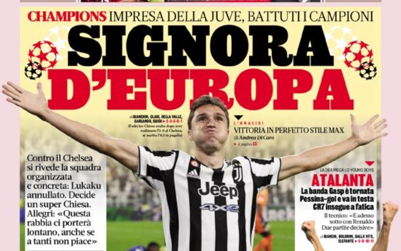 È la Champions League il tema principale sulle prime pagine dei quotidiani in edicola giovedì 30 settembre 2021. Tengono banco le vittorie di Juventus e Atalanta contro Chelsea e Young Boys: entrambe le formazioni sono prime nei loro gironi.