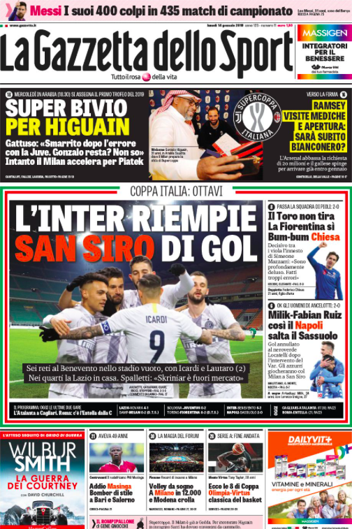 “L’Inter riempie San Siro di gol”: l’apertura scelta da La Gazzetta dello Sport si concentra sul netto successo dell’Inter ottenuto in Coppa Italia sul Benevento, in uno stadio senza pubblico post squalifica per gli ululati razzisti rivolti a Koulibaly nello scorso Inter-Napoli. In alto, focus sulla situazione Higuain (“Super bivio per Higuain”), con il Milan che accelera per Piatek in caso di addio dell’argentino: di fianco, le chances in aumento di vedere Ramsey vestire già la maglia della Juventus (“Visite mediche e apertura: sarà subito bianconero?”). Di lato i successi di Fiorentina e Napoli in Coppa Italia: in basso, invece, l’addio a Philemon Masinga, ex calciatore del Bari scomparso ieri.