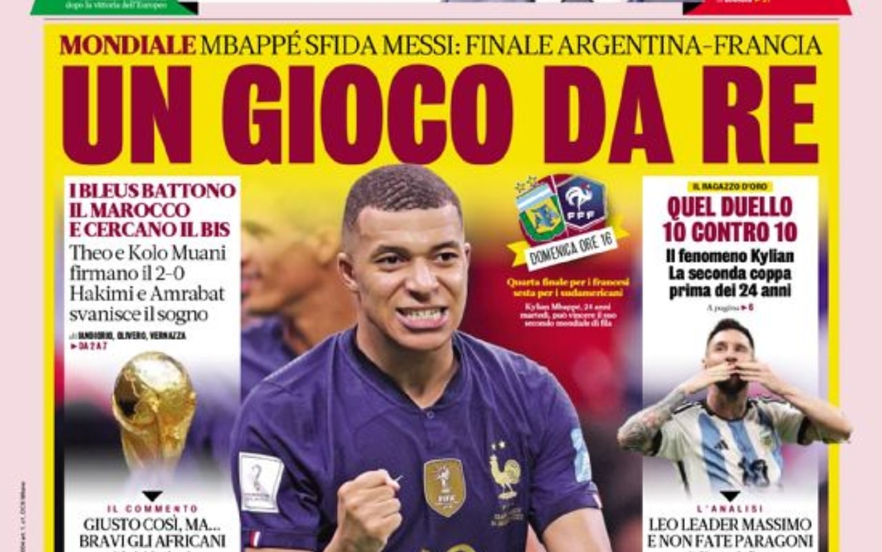 La Francia batte il Marocco e conquista la finale dei Mondiali: ad attendere la nazionale di Deschamps c’è l’Argentina. Questi e tanti altri i temi affrontati nelle prime pagine sportive dei quotidiani in edicola oggi, venerdì 15 dicembre 2022.