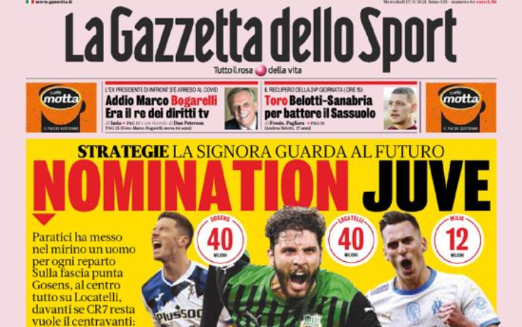 La Champions League, con l'eliminazione dell'Atalanta per mano del Real Madrid e l'impegno odierno della Lazio contro il Bayern Monaco, l'Europa League, che domani vedrà in campo Roma e Milan, ma anche la Serie A, con il recupero di oggi tra Torino e Sassuolo e le vicende in casa Inter e Juventus. Sono questi i temi principali sulle prime pagine dei quotidiani in edicola mercoledì 17 marzo.