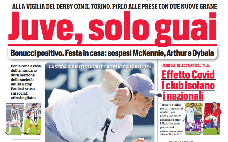 La positività di Bonucci e la decisione del Sassuolo di escludere dalla prossima gara con la Roma, in via precauzionale, gli atleti che hanno partecipato alle gare con la Nazionale. Poi la cena/festa privata in casa McKennie in cui erano presenti anche Arthur e Dybala e il mercato: Raiola e il padre di Haaland volano in Spagna per sondare la volontà di Barcellona e Real Madrid in merito alla stella del Borussia Dortmund. Questi, e tanti altri, i temi nelle prime pagine dei quotidiani sportivi in edicola il 2 aprile 2021.