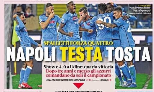 Il Napoli è primo in solitaria. Dopo la vittoria sull’Udinese per 4-0, che chiude la 4ª giornata di Serie A, gli azzurri sono a punteggio pieno. È questo, con un occhio al turno infrasettimanale, il focus dei quotidiani sportivi in edicola martedì 21 settembre 2021