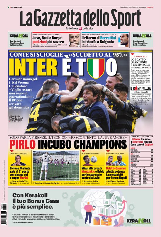La domenica di Serie A sulle prime pagine dei principali quotidiani in edicola lunedì 26 aprile. Dall’Inter sempre più vicina al titolo alla lotta per Champions League e salvezza. Poi spazio anche ai due posticipi: alle 18.30 c’è Torino-Napoli, alle 20.45 lo scontro Champions tra Lazio e Milan.