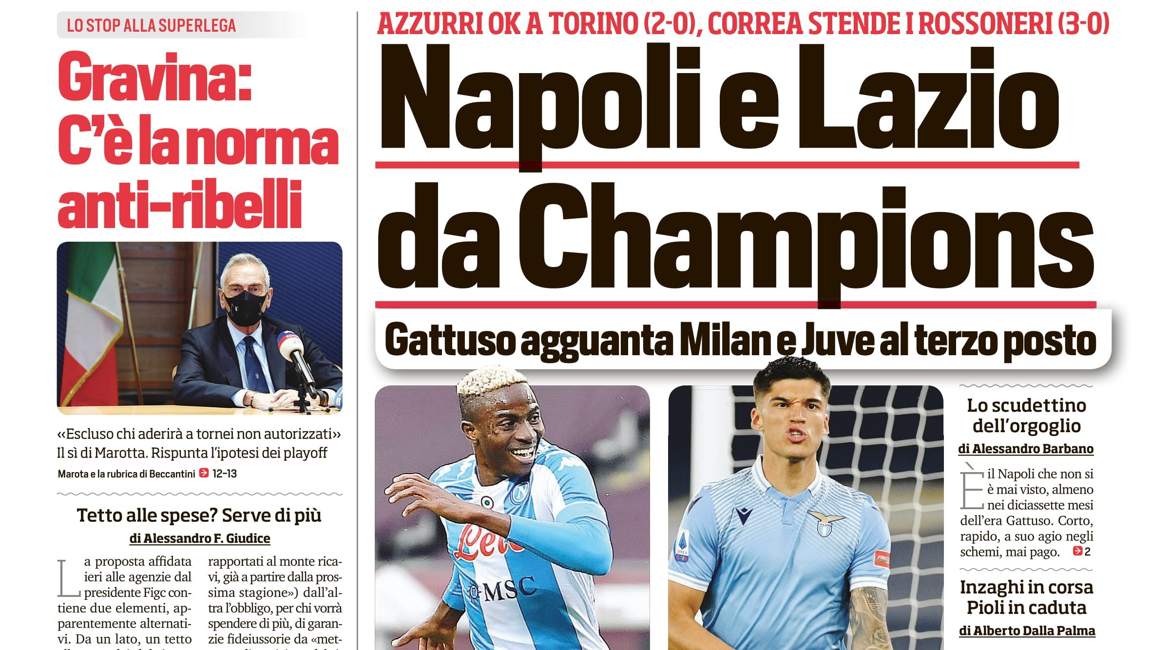Si conclude anche la 33a giornata di Serie A: le vittorie di Napoli e Lazio restituiscono una lotta per la prossima Champions entusiasmante con un finale apertissimo e cinque squadre per tre posti. Ma è stata anche la giornata della norma “anti-Superlega”: di questo, delle semifinali di questa Champions League e di calciomercato si parla nelle prime pagine in edicola.