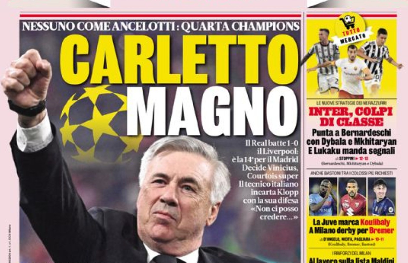 La scena nelle prime pagine dei quotidiani italiani e non se la prendono il Real Madrid e Carlo Ancelotti. La squadra spagnola ha vinto la quattordicesima Champions League della propria storia, la seconda con l’allenatore italiano in panchina che ora diventa il più titolato al mondo. Nessun allenatore ne ha vinte quante lui.