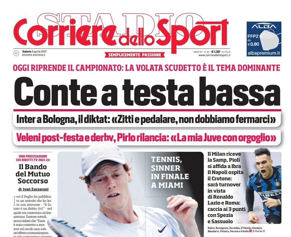 Torna la Serie A e riprendono la volata scudetto, la corsa alla Champions League e la fuga dalle zone pericolose della bassa classifica. Il campionato ritrova i grandi duelli rimasti in sospeso con la sosta in una 29esima giornata che si gioca tutta di sabato. Dal Milan che apre contro la Samp a San Siro, al derby della Mole delle 18 e fino all'impegno dell'Inter in casa del Bologna: questi i principali temi sulle prima pagine dei quotidiani in edicola oggi.