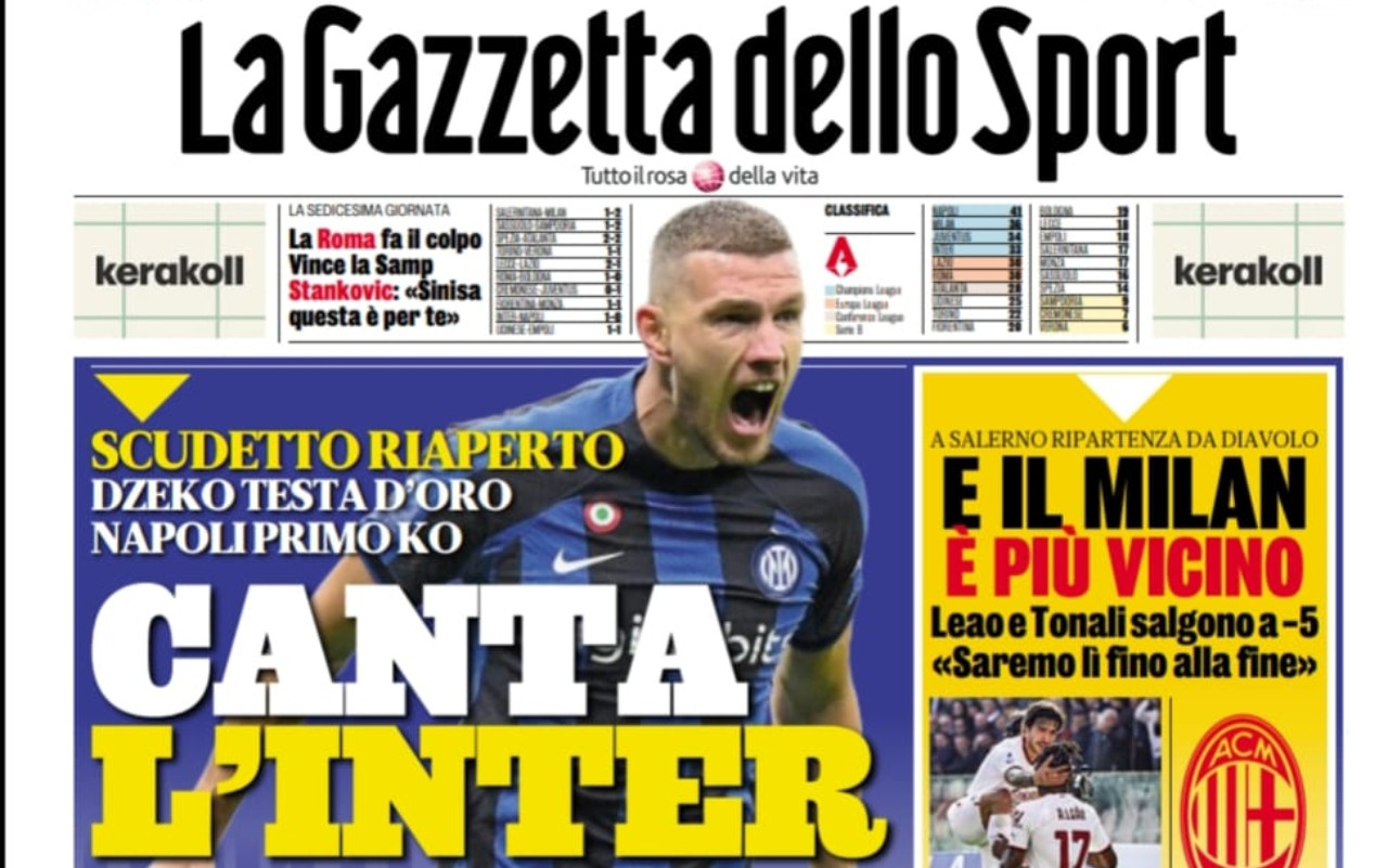 È ripartita la Serie A. Juventus, Inter e Milan hanno subito vinto. I nerazzurri hanno fermato il Napoli nel big match della ripresa della campionato, mentre bianconeri e rossoneri hanno ottenuto i rispettivi successi sui campi di Cremona e Salerno. Parte bene anche la Sampdoria che una vittoria utile in ottica salvezza. Questi e molti altri temi nelle prime pagine dei quotidiani sportivi e non in edicola oggi.