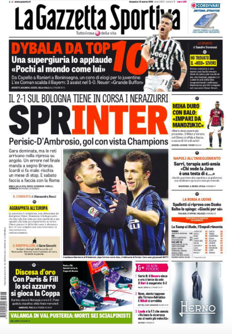 Anche La Gazzetta dello Sport parla di “Sprinter”, con i “gol in vista Champions” di Perisic e D’ambrosio; nel taglio alto spazio a Dybala, vero e proprio uomo del giorno. Nella spalla Mihajlovic dà un consiglio a Balotelli: “Impari da Mandzukic”. Un’altra giornata di calcio se n’è andata, ma noi di gianlucadimarzio.com saremo pronti a darvi il buongiorno.