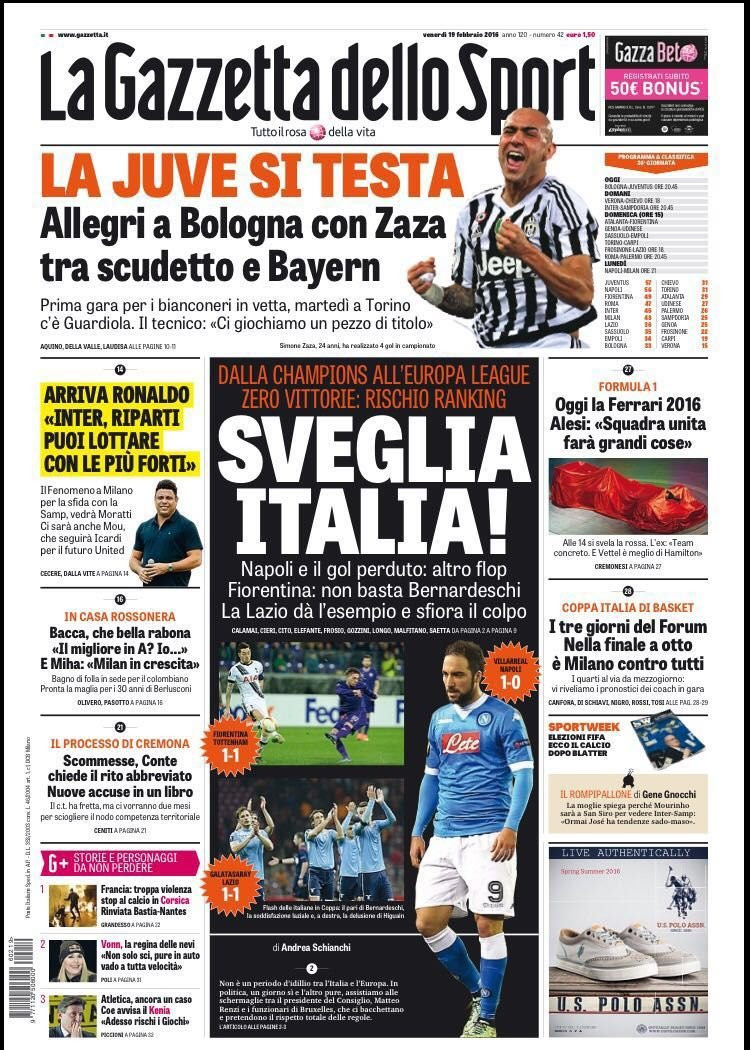 La Gazzetta dello Sport apre con “Sveglia Italia!”: non è stata una due giorni europea memorabile. Nessuna vittoria, due pareggi e due sconfitte. Brucia quella del Napoli a Vilareal, la seconda consecutiva senza far gol. Alla Fiorentina non basta Bernardeschi, la Lazio è la migliore. “La Juve si testa”: Bologna è un crocevia importantissimo, ma c’è anche il Bayern all’orizzonte. E infine l’Inter, con Ronaldo annunciato a San Siro sabato, che dice alla sua ex squadra: “Riparti, puoi lottare con le più forti”.