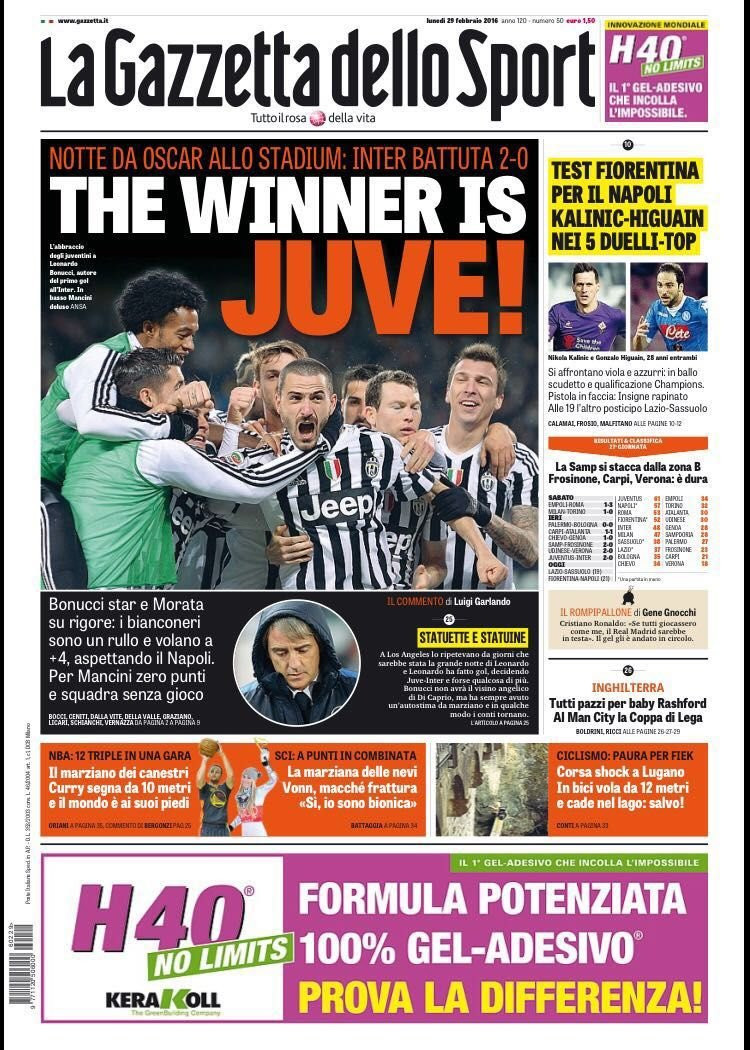 Il confronto di Torino campeggia in primo piano anche sulla prima della Gazzetta dello Sport che, in uno stile un po’ british titola “The winner is Juve”, facendo un chiaro riferimento alla notte degli Oscar che si appresta ad incoronare i migliori attori di Hollywood. Spazio poi al duello Kalinic-Higuain, che esalterà il ‘test Fiorentina del Napoli’.