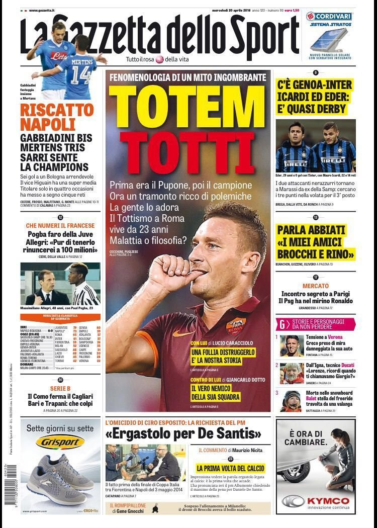 L’intricata situazione Totti, un Napoli travolgente, una Juventus sempre più dominante e qualche scenario futuro ancora in attesa di essere chiarito, con la situazione Torino-Ventura a tener banco e la permanenza di Paul Pogba in maglia Juve tra i possibili desideri di Massimiliano Allegri, anche di fronte ad un’offerta da 100 milioni. Tanti, come sempre, i temi presentati dalle prime pagine dei principali quotidiani sportivi, partendo da La Gazzetta dello Sport: “Totem Totti” il titolo in prima pagina della rosea, pronta ad analizzare un passato da “Pupone” ed un presente vicino ad un tramonto ricco di polemiche. Spalla dedicata al “Riscatto Napoli“, trascinato da Gabbiadini e Mertens e volato momentaneamente a +8 sulla Roma.