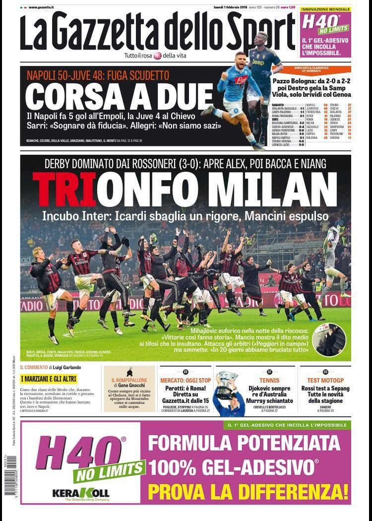 Grande risalto ovviamente sulla Gazzetta per il derby vinto dal Milan. “Trionfo Milan” campeggia a tutta pagina sul giornale milanese, il Corriere dello Sport parla di “Derby, godimento Milan” mentre Tuttosport definisce la squadra rossenera uno “Stramilan”.