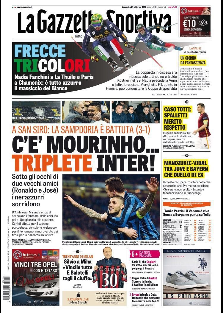“C’è Mourinho… Triplete Inter” è questo il titolo che sceglie la Gazzetta dello sport. 3 gol e 3 punti arrivati in un momento delicato della stagione. Il tutto con la presenza in tribuna di Josè Mourinho. “Mandzukic-Vidal tra Juve e Bayern che duello di ex” occupa la spalla del quotidiano. Il croato recupera dall’infortunio e potrebbe partire titolare nella gara di martedì, il cileno intanto dichiara: “Se segno, non esulto”.