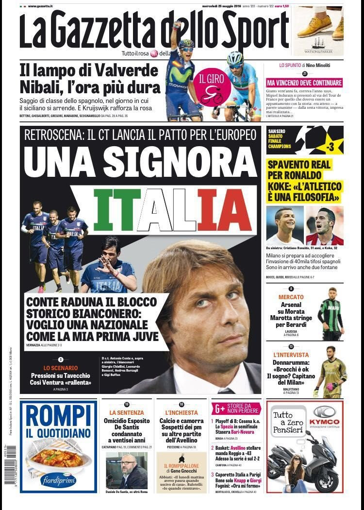La Gazzetta dello Sport invece dedica spazio alla Nazionale: Una Signora Italia. Conte raduna il blocco storico bianconero: voglio una squadra come la mia prima Juve. In spalla ecco l’accenno alla finale di Champions in programma sabato a San Siro, con il Real alle prese con lo spavento di perdere Ronaldo. L’ennesima giornata ricca di emozione si è appena conclusa, un’altra però è pronta ad iniziare per regalare nuovi colpi di scena da seguire ovviamente sempre con noi, qui su Gianlucadimarzio.com…