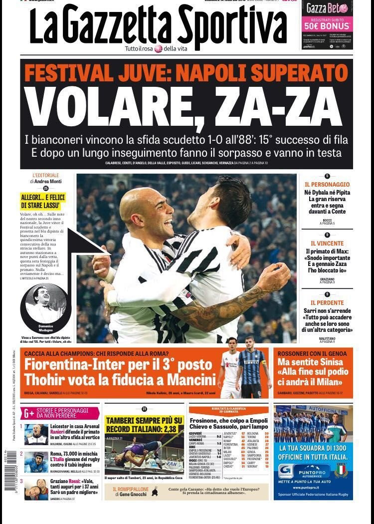 “Lassù c’è solo la Juve“, è il titolo del Corriere dello Sport. Gol-sorpasso di Zaza e la squadra di Allegri è ora prima. L’allenatore toscano azzecca il cambio e ottiene la quindicesima vittoria di fila. Ma il Napoli esce a testa alta. Si parla anche di Fiorentina-Inter, “è uno spareggio”.