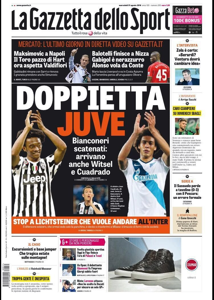 I giornali sportivi ci presentano gli ultimi colpi di un calciomercato giunto ormai alle battute conclusive. La Gazzetta dello Sport dedica la prima pagina alla Juventus, che si prepara ad accogliere Cuadrado e Witsel: “Doppietta Juve”, dunque. In taglio alto, il riassunto delle ultime trattative: Hart al Torino, Balotelli al Nizza, Alonso al Chelsea.