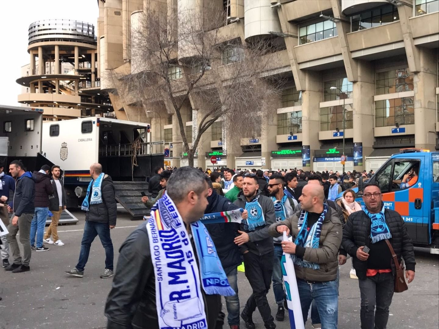 Ritrovo ad Avenida de Brasil, poi lunga marcia fino al Santiago Bernabeu. Tra cori e sorrisi: Napoli si ritrova a vivere ‘un giorno all’improvviso’ un sogno chiamato Real Madrid. Impensabile qualche anno fa, divenuto però incredibilmente realtà. Per una lunga attesa incominciata già questa mattina, con Madrid tinta d’azzurro come non mai. Plaza Mayor e Plaza del Sol invase dai tifosi del Napoli, clima di festa anche con tanti tifosi ‘blancos’. Ora si aspetta solo il fischio d’inizio, per 90 minuti di passione. Azzurra, ovviamente. E noi vi portiamo al Bernabeu, con le nostre immagini tra i tifosi del Napoli.