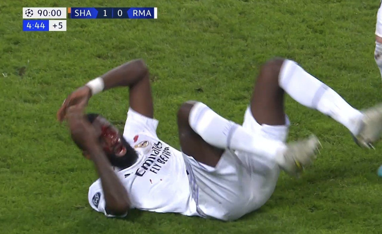 Il Real Madrid ha pareggiato al 95′ contro lo Shakhtar grazie al gol di Antonio Rudiger. La gioia del gol è però durata pochissimi secondi, perché l’ex centrale di Roma e Chelsea ha subito una botta potentissima in volto, perdendo tantissimo sangue dopo l’impatto.