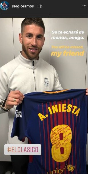 Quando si ritira un campione del genere, non c’è rivalità che tenga, non esistono colori: è proprio questo quello che ha dimostrato Sergio Ramos al termine della partita più seguita al mondo. Infatti, il capitano delle merengues, dopo il triplice fischio del Camp Nou, ha chiesto al suo amico e compagno di Nazionale Andrés Iniesta la “camiseta” con il quale il fenomenale centrocampista ha disputato il suo ultimo clasico. Dopo il bel gesto, Ramos ha voluto far vedere a tutti la maglietta regalatagli da Iniesta tramite i propri profili social: