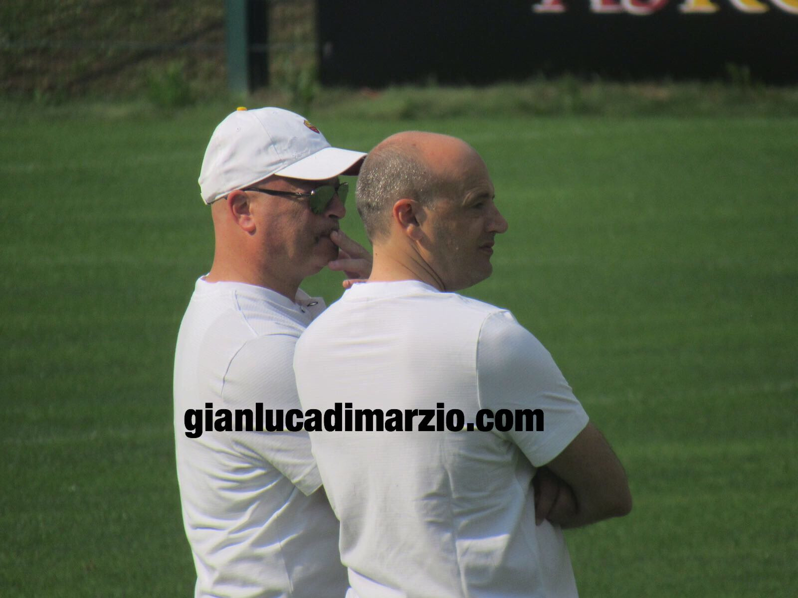 Anche il ds Baldissoni è arrivato al ritiro della Roma a Pinzolo. Nella foto eccolo a colloquio con Monchi prima dell’inizio dell’allenamento dei giallorossi.
