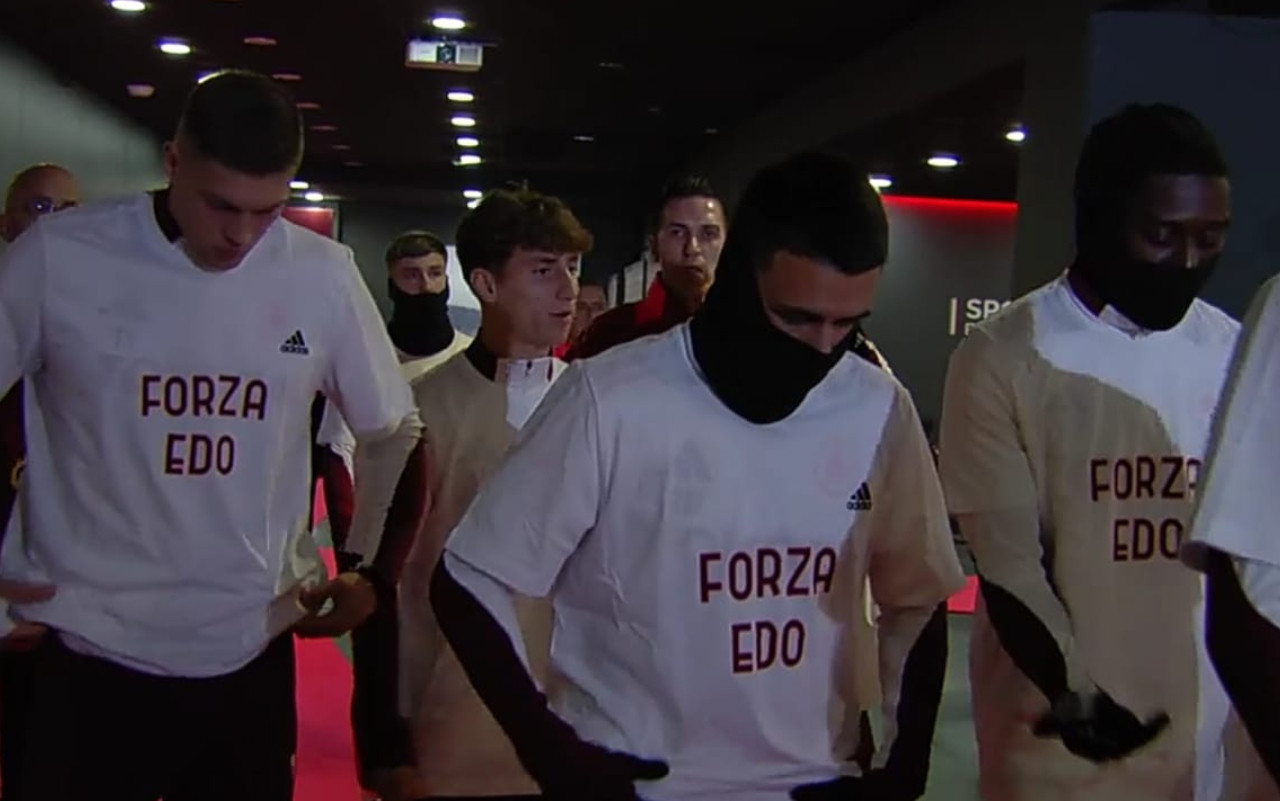 La Roma scende in campo con una maglia tributo a Edoardo Bove. I giallorossi, che nella serata di lunedì 2 dicembre affrontano l’Atalanta di Gian Piero Gasperini hanno effettuato il riscaldamento con una divisa speciale.