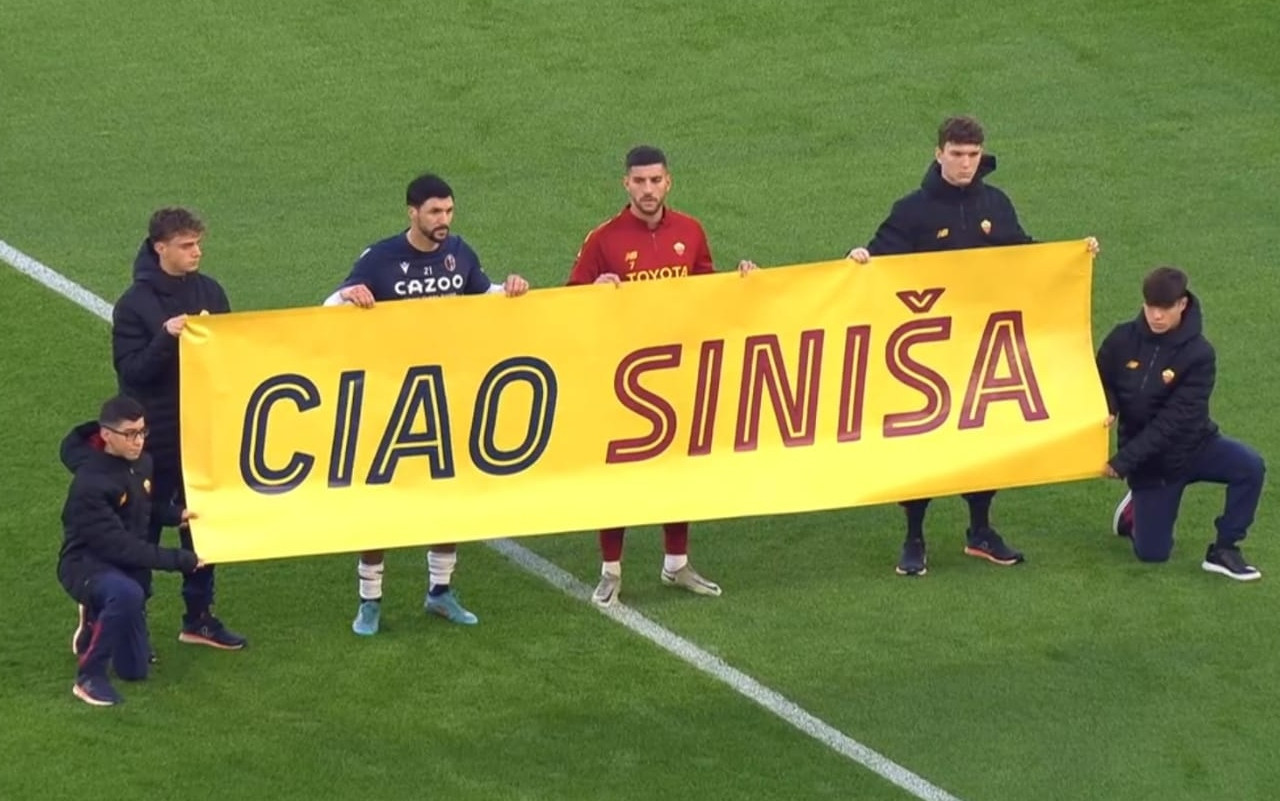 Due club, Roma e Bologna, entrambi dunque nel suo passato; e al ritorno in campo dopo la sosta, e soprattutto dopo la sua scomparsa, questo è stato l’omaggio delle due squadre: uno striscione con scritto “Ciao Sinisa” tenuto dai due capitani Pellegrini e Soriano con l’applauso dell’Olimpico in sottofondo.