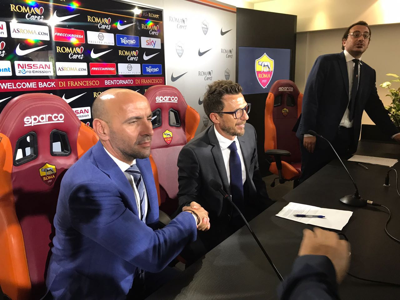Prende la parola prima il direttore sportivo Monchi: “Per la Roma e per me in particolare è un giorno molto felice, il ritorno di uno dei nostri. Un motivo d’allegria per la Roma, per me è importante perché dopo che Luciano mi aveva detto che sarebbe andato via, il mio obiettivo era chiaro: Eusebio doveva essere qui”. Quindi le prime parole dell’allenatore: “Prima di cominciare con le domande volevo ringraziare il presidente Pallotta, Gandini, Baldissoni e Monchi per questa opportunità. E’ un’occasione unica e sono felice di raccoglierla. Saluto e ringrazio il Sassuolo calcio, dai magazzinieri ai tifosi, lo staff, i calciatori e i direttori. Ringraziamento particolare al dr. Squinzi per fiducia, stima e affetto che mi ha dato. Sassuolo è una pagina di sport indelebile per me”.