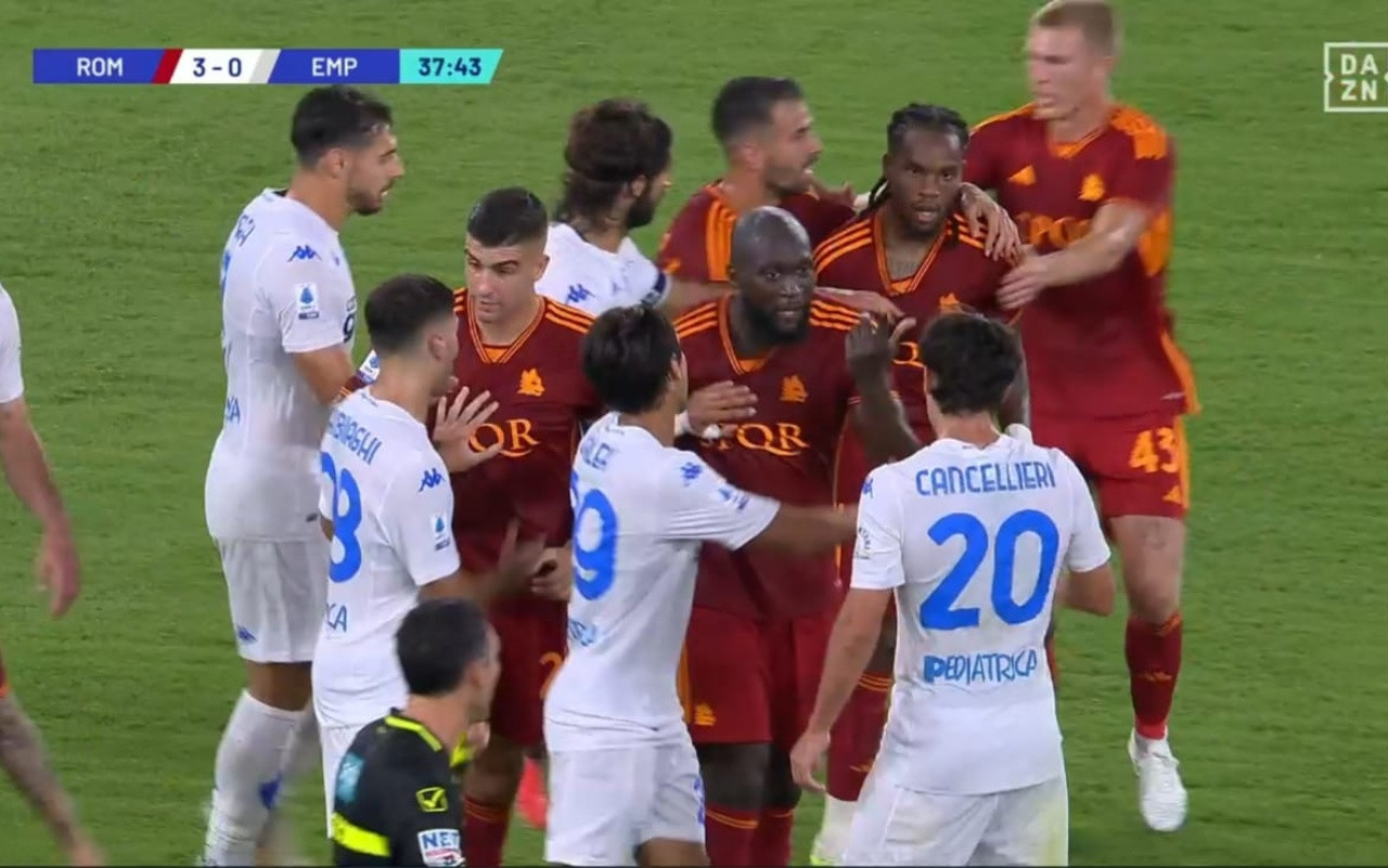 Sulla trequarti offensiva della Roma, l’arbitro ha fischiato un fallo a favore dell’Empoli in seguito a un intervento di Dybala su Bereszynski, ammonendo l’argentino. Qualche metro avanti, uno scambio di battute tra Ndicka e Cancellieri ha portato alla reazione di quest’ultimo, che ha avvicinato la testa a quella del difensore romanista. Vedendo la scena, con Ndicka rimasto a terra dopo il colpo, comunque leggero, Renato Sanches e altri giocatori della Roma sono intervenuti, scatenando un principio di rissa. Il tutto è stato sedato dal direttore di gara, che ha ammonito entrambi i giocatori, che si sono quindi spiegati.