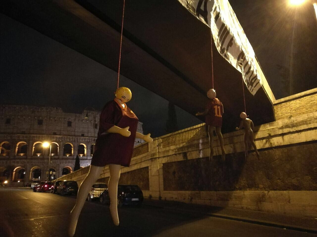 Scene da film horror nella capitale. Nella notte è stato esposto uno striscione a pochi metri dal Colosseo: “Un consiglio, senza offesa… dormite con la luce accesa!“. Non è tutto però, perchè ad accompagnare questa scritta c’erano quattro manichini (uno senza maglia, gli altri con addosso la casacca giallorossa di De Rossi, Salah e Nainggolan).Eliminazione agli ottavi di Europa League, dalla Coppa Italia per mano della Lazio e derby perso anche in campionato. Tutto questo potrebbe non essere stato digerito dai tifosi giallorossi. Un messaggio il cui mittente è al momento impossibile da identificare. Potrebbe trattarsi dei tifosi della Roma, o addirittura di quelli della Lazio. Questo ha subito richiamato l’attenzione dei passanti con le forze dell’ordine che si sono immediatamente mobilitate per far rimuovere il tutto: era l’una di notte. In mattinata sono arrivate le parole dell’assessore allo Sport di Roma in merito alla vicenda: “Questa notte, a due passi dal Colosseo, alcune persone hanno esposto dei manichini impiccati e uno striscione con un messaggio di minaccia contro il club giallorosso. Un atto vergognoso e una grave offesa ai valori e al mondo dello sport”.