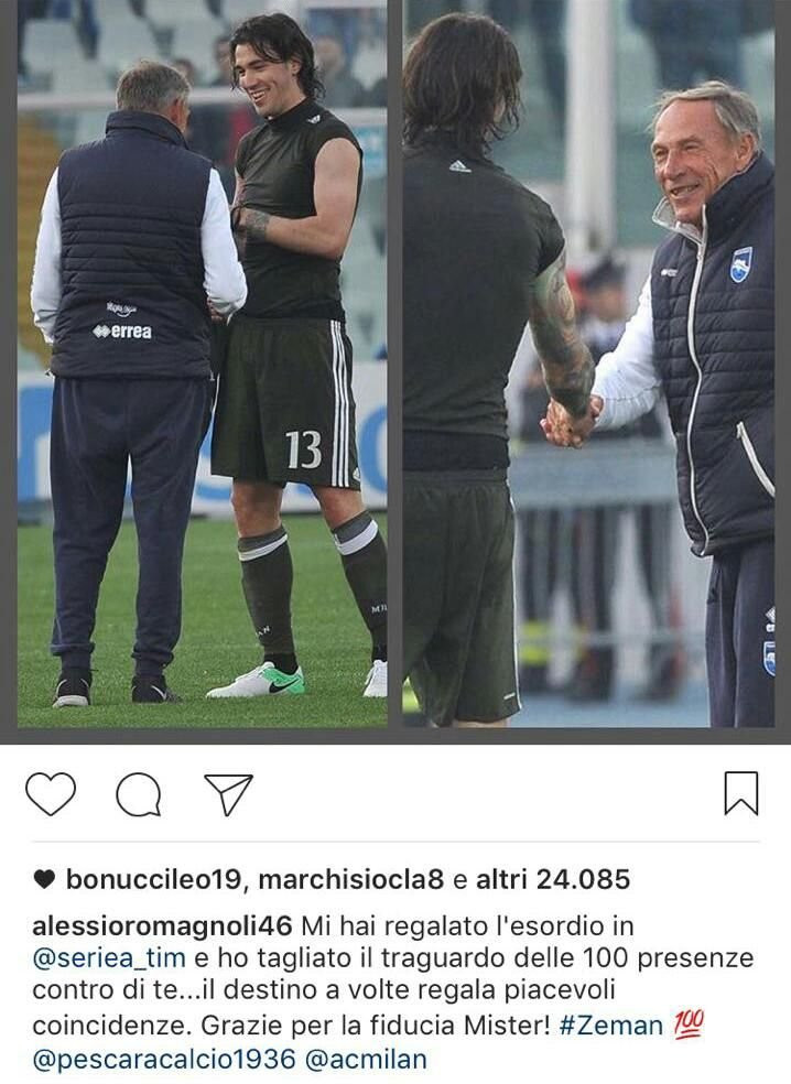 Un messaggio d’affetto, di stima. Alessio Romagnoli, che domenica ha raggiunto quota 100 presenze in Serie A nella gara contro il Pescara, non ha dimenticato chi gli ha regalato la gioia della prima nel nostro massimo campionato. Ed ecco allora che sui suoi profili social ha pubblicato una foto che lo ritrae insieme a Zdenek Zeman. Perché è stato proprio il boemo (nella sua seconda avventura alla Roma) a far vivere per la prima volta la Serie A a quel ragazzino che allora aveva 17 anni. “Mi hai regalato l’esordio in A e ho tagliato il traguardo delle 100 presenze contro di te…il destino a volte regala piacevoli coincidenze. Grazie per la fiducia Mister!”, questo il messaggio del difensore rossonero al boemo. Un allenatore che ha più volte dichiarato di considerare un maestro. Dalla numero uno alla numero 100, ecco come Zeman ritorna nelle tappe importanti della carriera di Romagnoli.