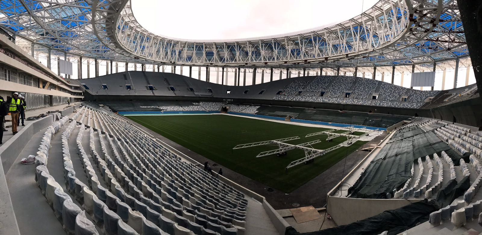 Come quello dell’Olimpiyets, la squadra di casa fondata 2 anni fa e con uno stadio da 45mila posti… per la seconda divisione. “Siamo ambiziosi – ci racconta il suo allenatore, Nikolaj Pisarev – vogliamo la promozione entro un paio di stagioni”. Staremo a vedere. Lui, ex calciatore dello Spartak, ha allenato l’U21 russa per 5 stagioni. Qualche chicca: “Kokorin è il più forte che ho avuto, mentre Dzagoev è cresciuto rapidamente ma poi è rimasto lì, sempre al Cska. Poteva approdare in grandi club, ma il presidente non l’ha mai voluto cedere. Lo ricordo come un bravo ragazzo, tecnico e veloce”. Pronostico sul Mondiale? “La Russia può passare il girone, ma ormai i calciatori giocano quasi tutti qui. Il livello non è competitivo. Ed esportiamo più giocatori di hockey che calciatori!”. Sorride, ma le sue parole sono vere. Ora i suoi nuovi ragazzi però, i suoi nuovi obiettivi. Con uno stadio così stanno davvero un passo avanti. E noi vi portiamo proprio lì, in uno degli impianti costruiti per i Mondiali e ancora in costruzione (i lavori finiranno a dicembre). Quarta tappa, ecco il Nizhny Novgorod Stadium.