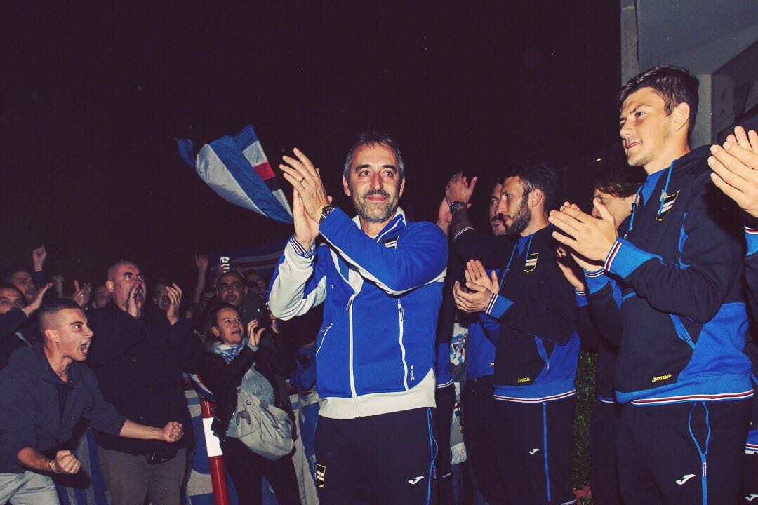 Dimostriamo di valere 14 punti in più anche sugli spalti” il messaggio del club Fedelissimi 1961, tifosi della Sampdoria che per evitare cali di tensione e per caricare la squadra in vista della stracittadina si sono dati appuntamento questa sera all’AC Hotel di Nervi, sede del ritiro blucerchiato, per caricare la squadra. Cori, bandiere e tanto entusiasmo a poco più di ventiquattr’ore dal fischio d’inizio. Quello del Derby della Lanterna, eterna sfida a tinte rossoblucerchiate: pronto a regalare l’ennesimo incredibile spettacolo. Antipasto, la carica a Quagliarella è compagni nella sede del ritiro della Samp: ecco tutte immagini.