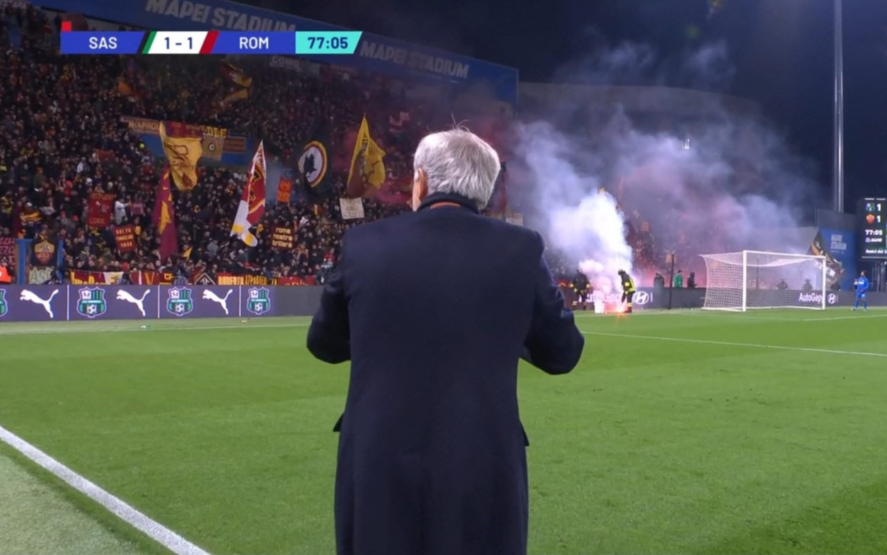 Intorno al settantacinquesimo minuto di Sassuolo-Roma, subito dopo il gol del pareggio giallorosso, José Mourinho è dovuto intervenire per cercare di “placare” la sua tifoseria. Dal settore riservato ai tifosi ospiti erano partiti infatti dei fumogeni che avevano tardato di qualche istante la ripresa del gioco.
