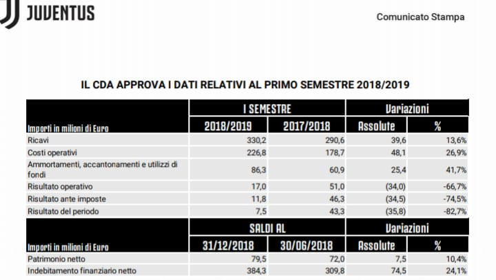 Il Cda della Juventus si è riunito nelle scorse ore per approvare i dati relativi al primo semestre della stagione 2018/2019. Per una maggiore chiarezza. è bene ricordare che l’esercizio non coincide con l’anno solare ma copre il periodo relativo alla stagione sportiva, che va dal primo luglio 2018 al 30 giungo 2019. Secondo quanto appreso dalla nota pubblicata sul sito ufficiale del club bianconero, il primo semestre dell’esercizio 2018/2019 si è chiuso con un utile di € 7,5 milioni che evidenzia una variazione negativa di € 35,8 milioni rispetto all’utile di € 43,3 milioni dell’analogo periodo dell’esercizio precedente.